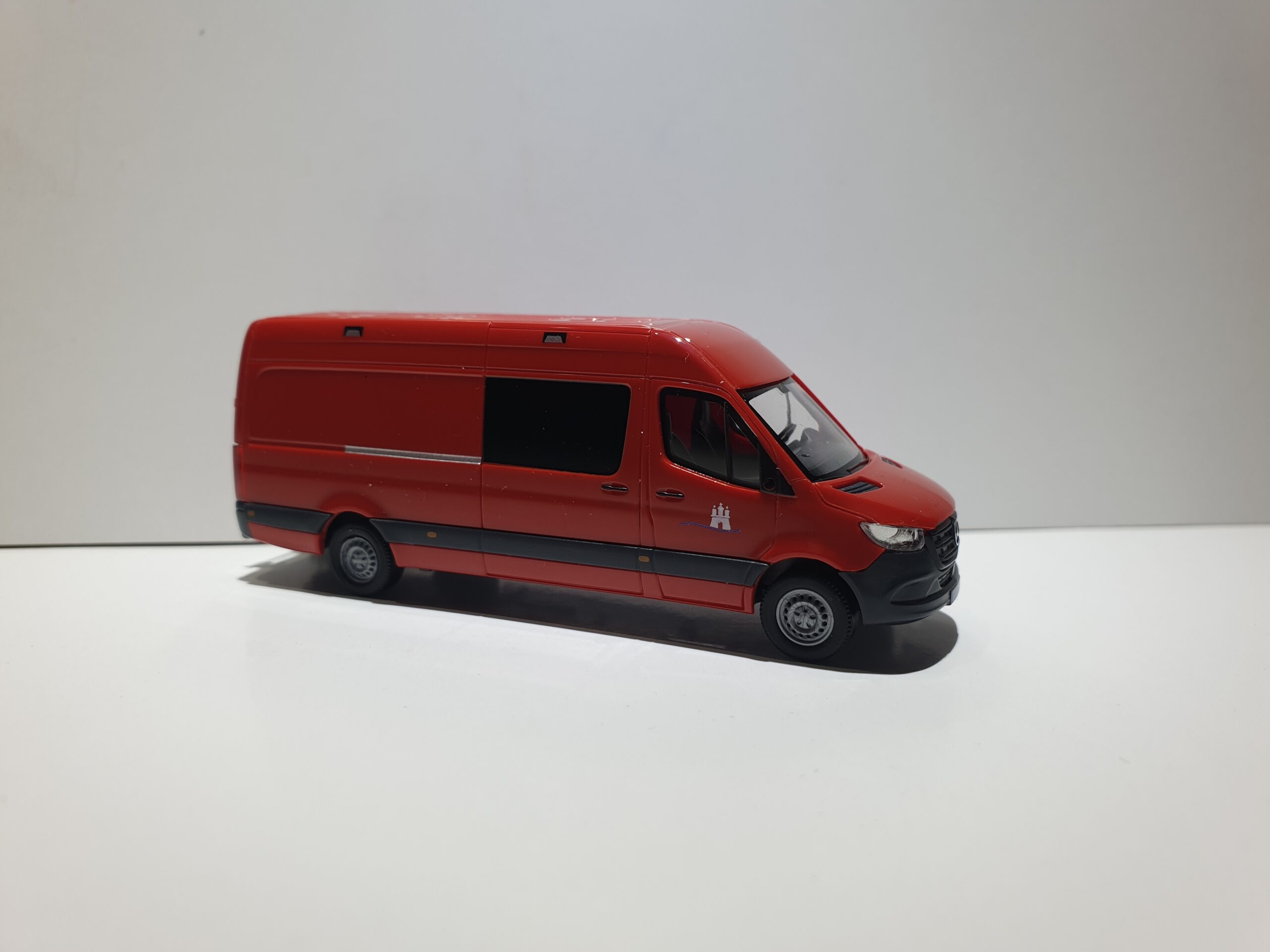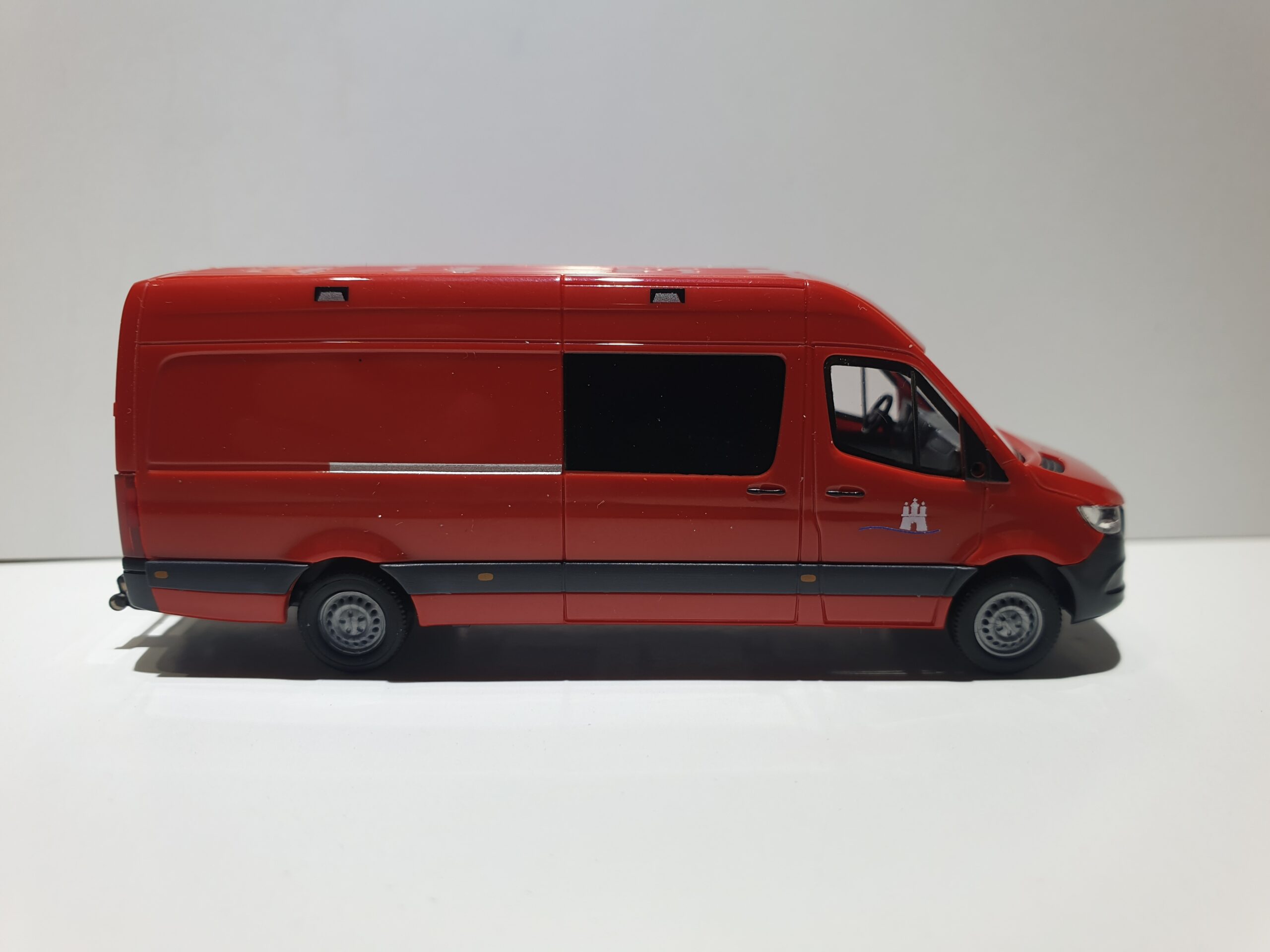 Busch MB Sprinter 18 LR mit Ladebordwand Feuerwehr Hamburg “ Abteilung Technik „. Modell ist im typischen Hamburger Design bedruckt. Das Modell ist allseitig mehrfach bedruckt inklusiv KFZ-Kennzeichen. Auflage 300 Stück.Modell ist in RAL 3000. Die von Busch angebaute halbe Ladebordwand ist ein Kleinserienmodell von der Firma Mickon, auch hier wurden die dazugehörigen Details aufgedruckt, wie z.B. das KFZ Kennzeichen usw.