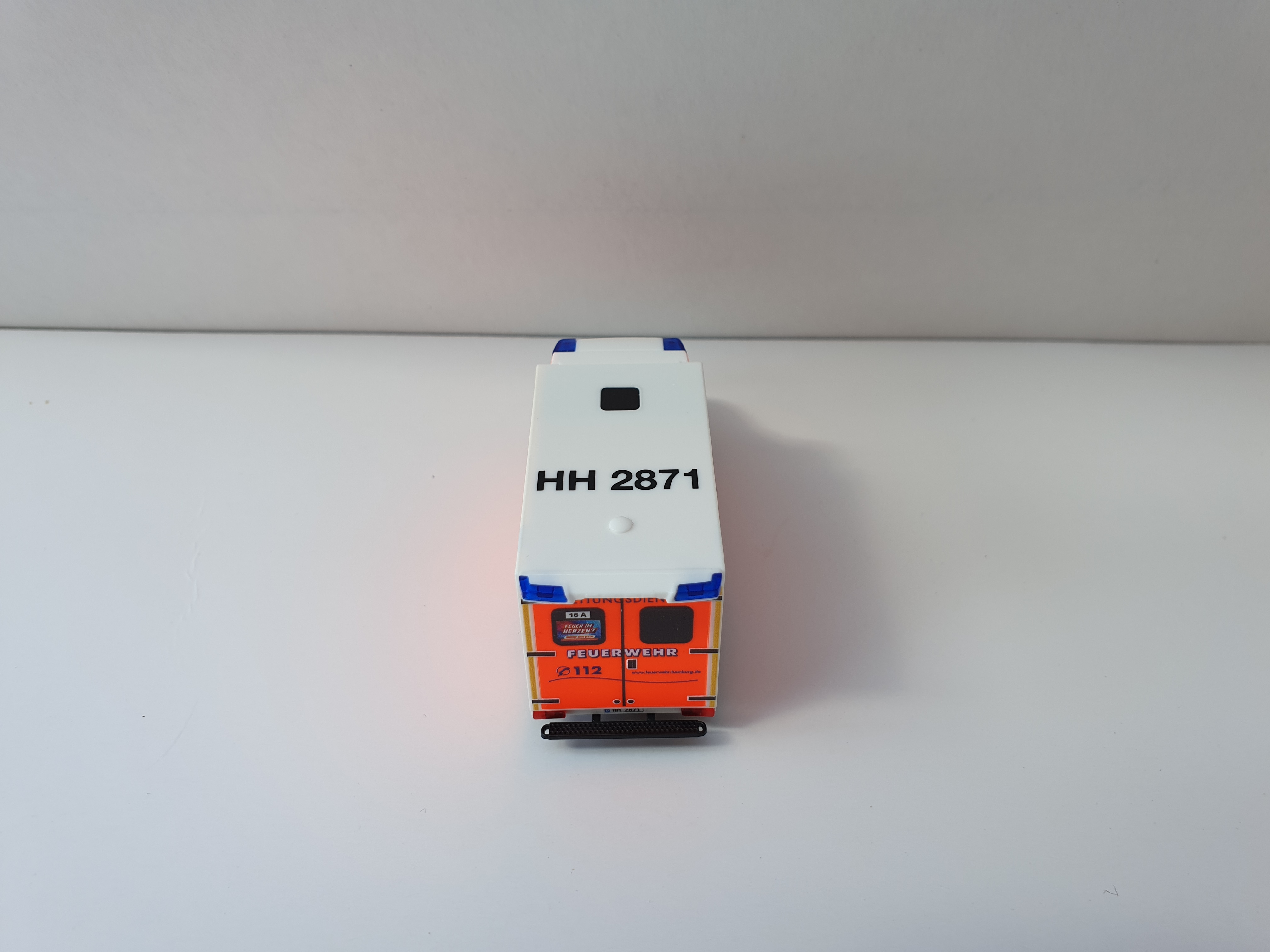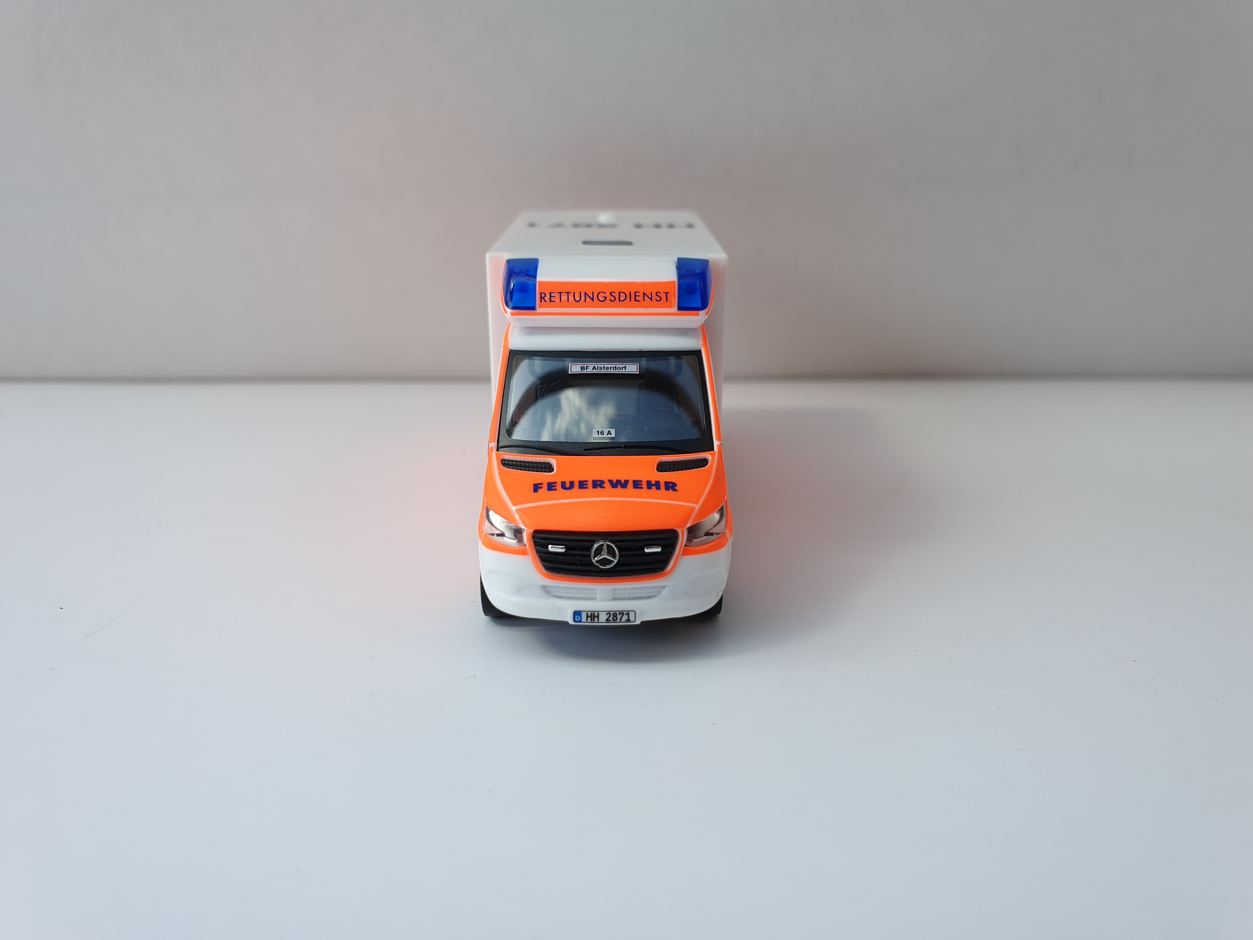 Herpa MB Sprinter 18 RTW BF Hamburg Alsterdorf, HH 2871. Das Modell ist allseitig im Hamburger Klebefoliendesign bedruckt. Modell ist allseitig mehrfach bedruckt, wie z.B. Wachkennung, KFZ-Kennzeichen, Dachkennung, Logo usw. Das Grundmodell ist in weiß.