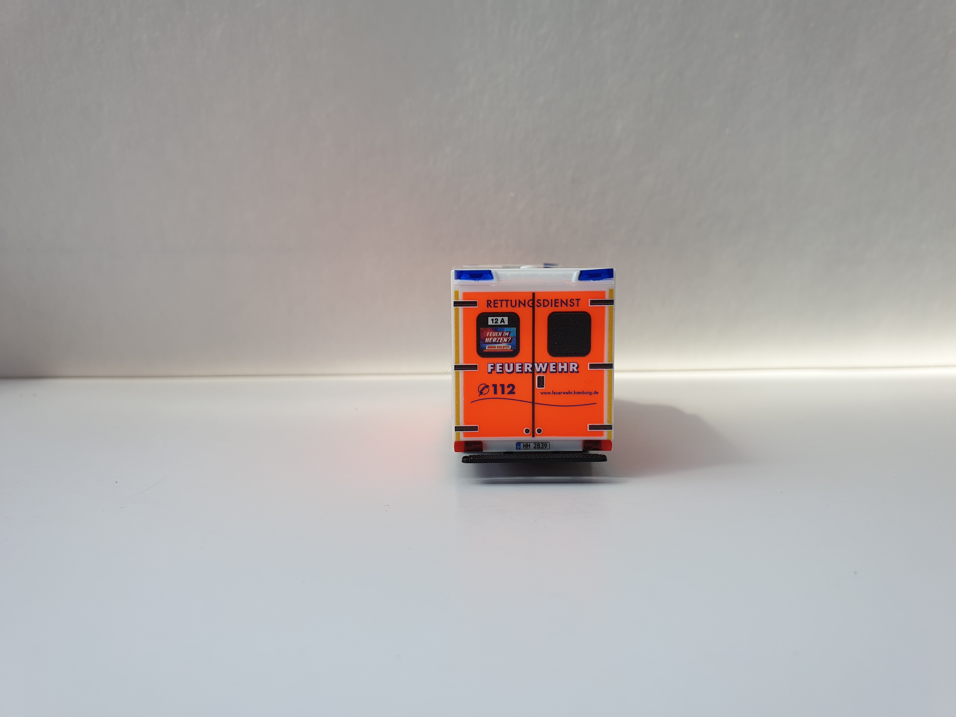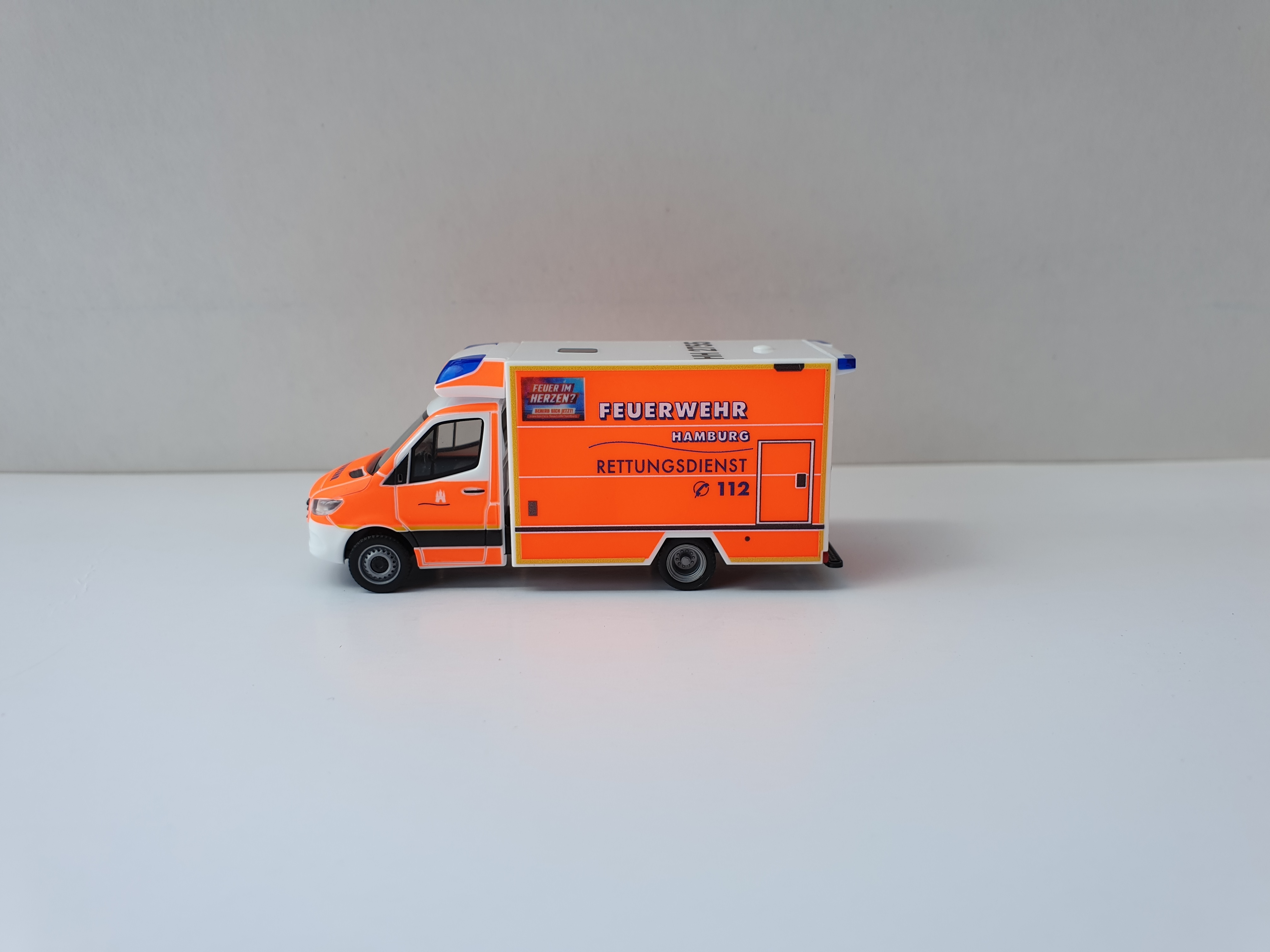 Herpa MB Sprinter 18 RTW BF Hamburg Altona, HH 2839. Das Modell ist allseitig im Hamburger Klebefoliendesign bedruckt. Modell ist allseitig mehrfach bedruckt, wie z.B. Wachkennung, KFZ-Kennzeichen, Dachkennung, Logo usw. Das Grundmodell ist in weiß.