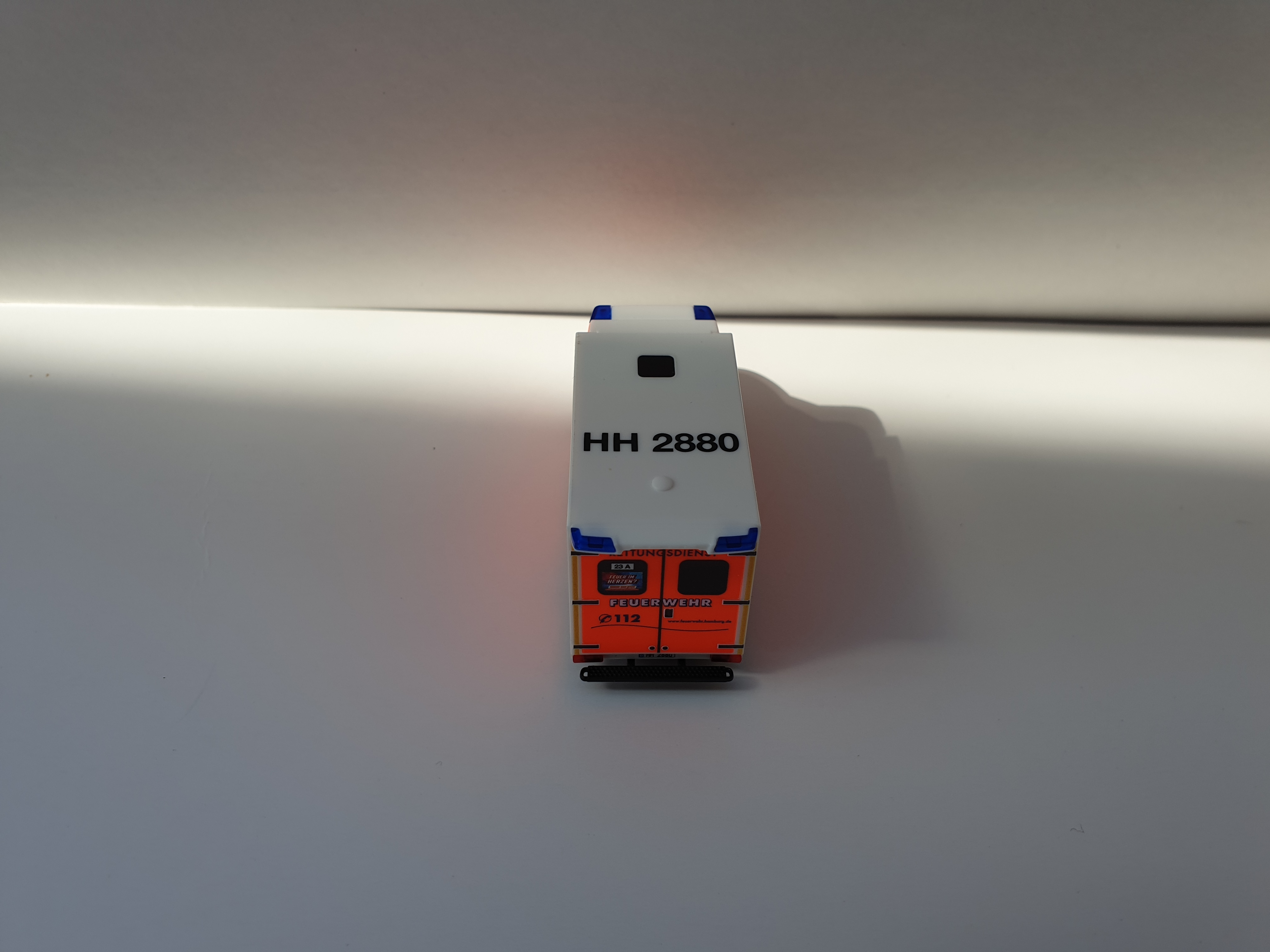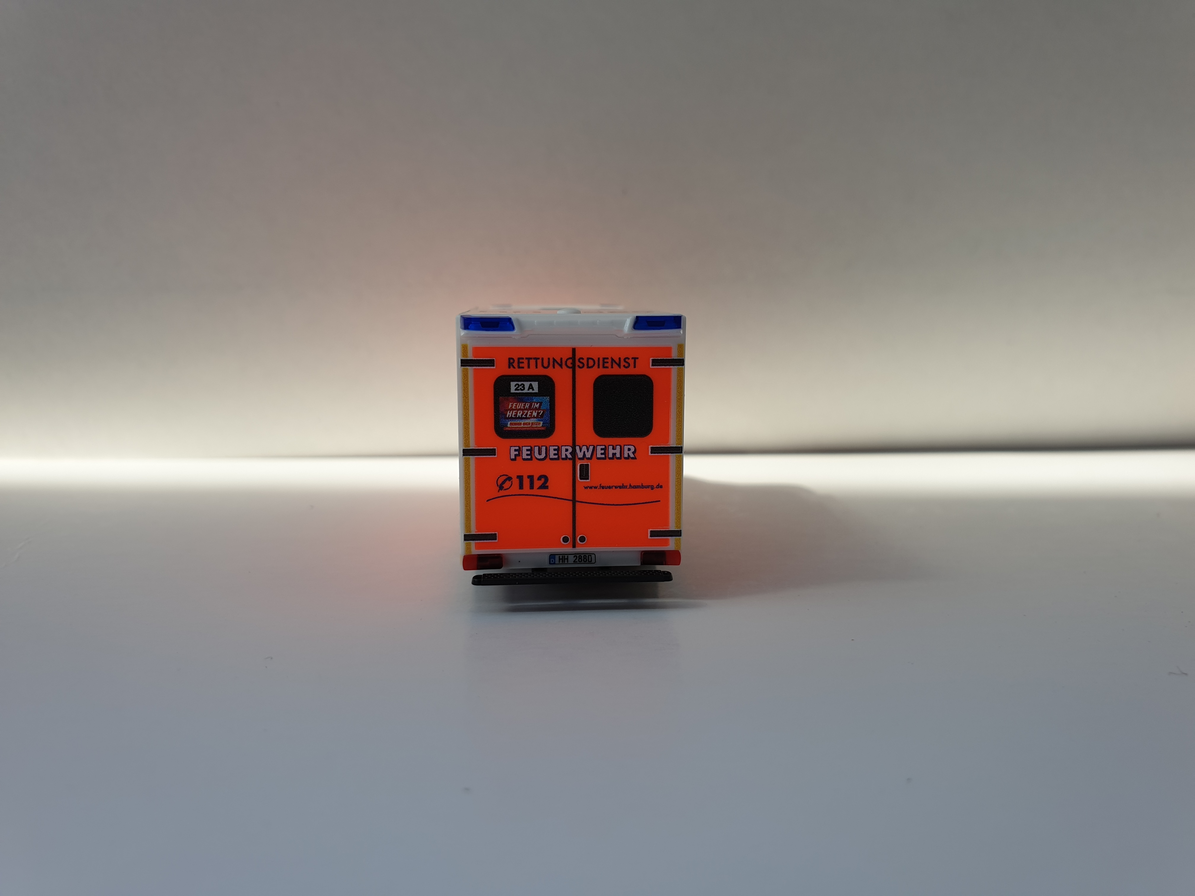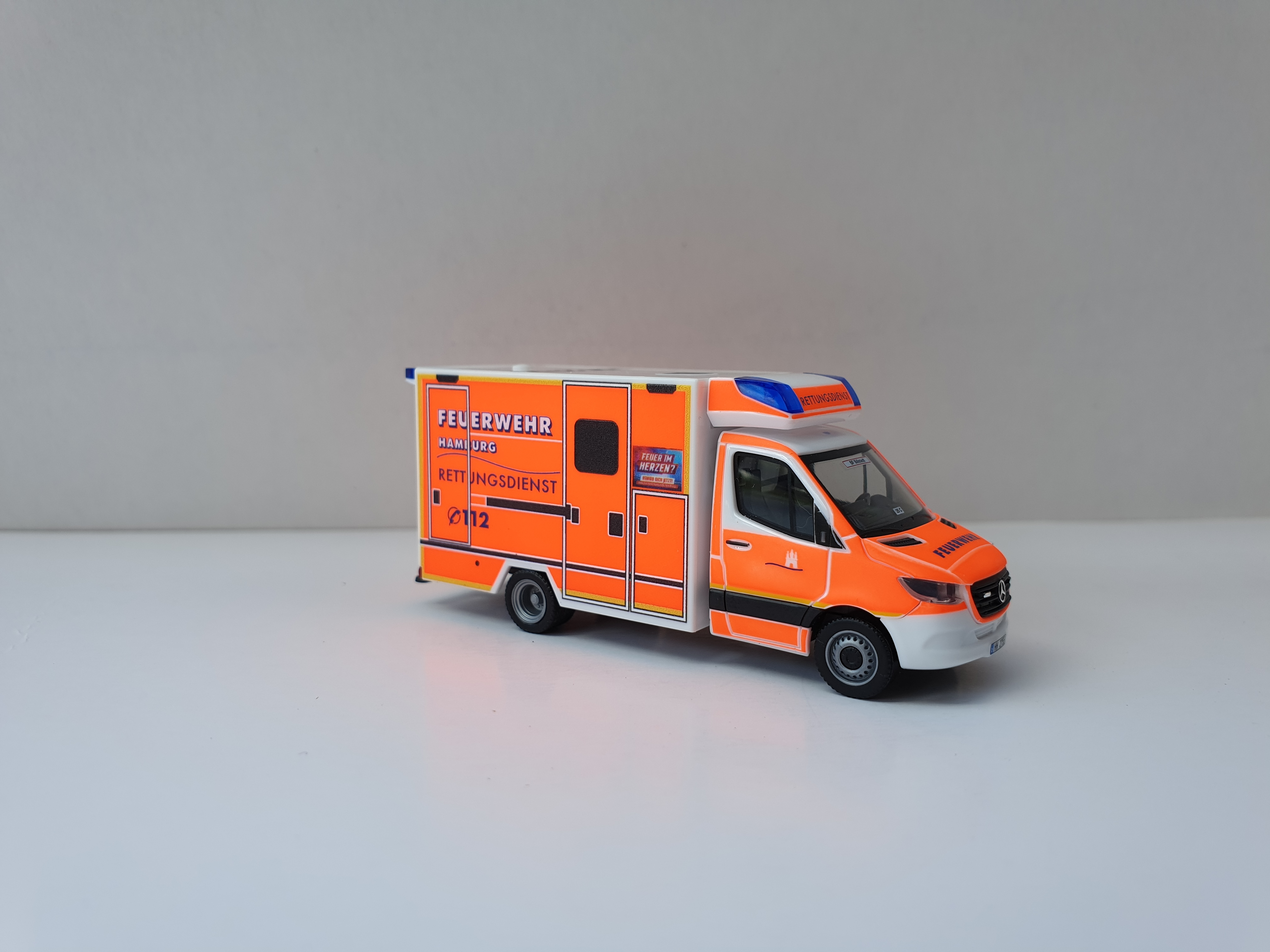 Herpa MB Sprinter 18 RTW BF Hamburg Barmbek HH 2880. Das Modell ist allseitig im Hamburger Klebefoliendesign bedruckt. Modell ist allseitig mehrfach bedruckt, wie z.B. Wachkennung, KFZ-Kennzeichen, Dachkennung, Logo usw. Das Grundmodell ist in weiß.