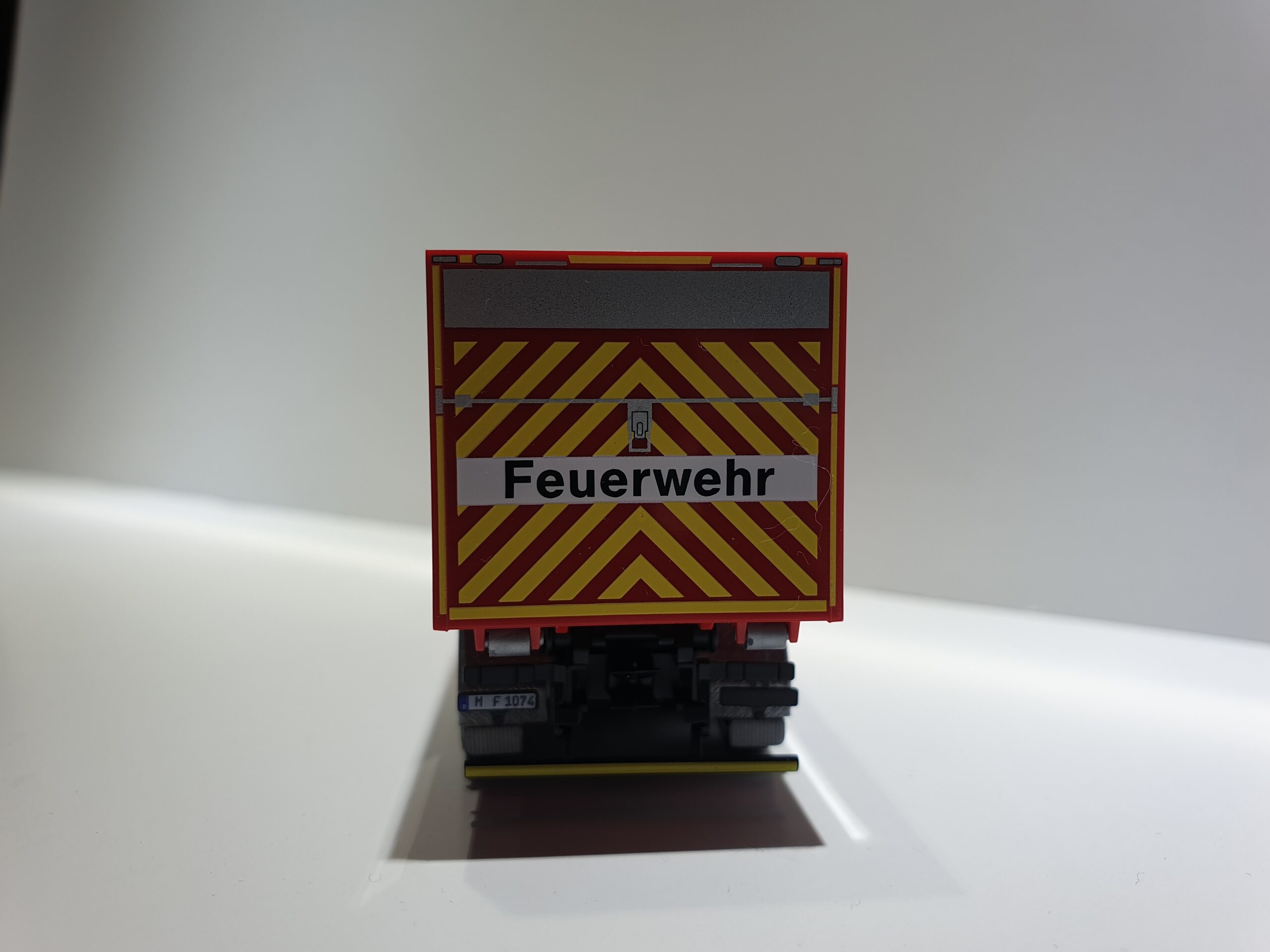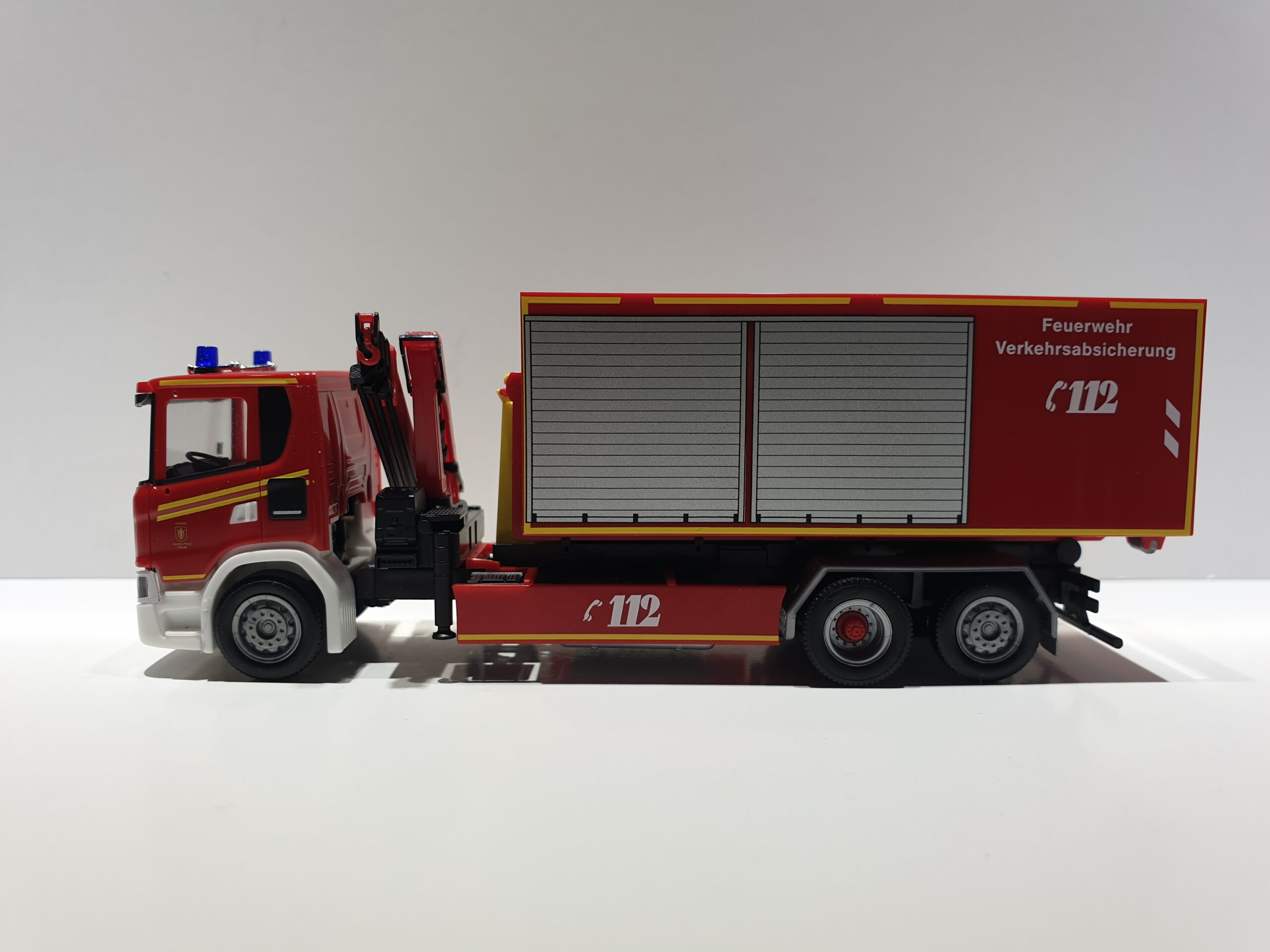 Herpa Scania CG 17 WLF mit Kran Feuerwehr (BF) München FW 9 mit AB Verkehrsabsicherung. Modell ist in RAL 3000 und in gelben typischen Design der Feuerwehr München bedruckt. Modell ist allseitig mehrfach unterschiedlich bedruckt, wie z.B. KFZ-kennzeichen, interne Kennung, Logo usw. Auflage 350 Stück. Das Modell kann zum Original abweichen.