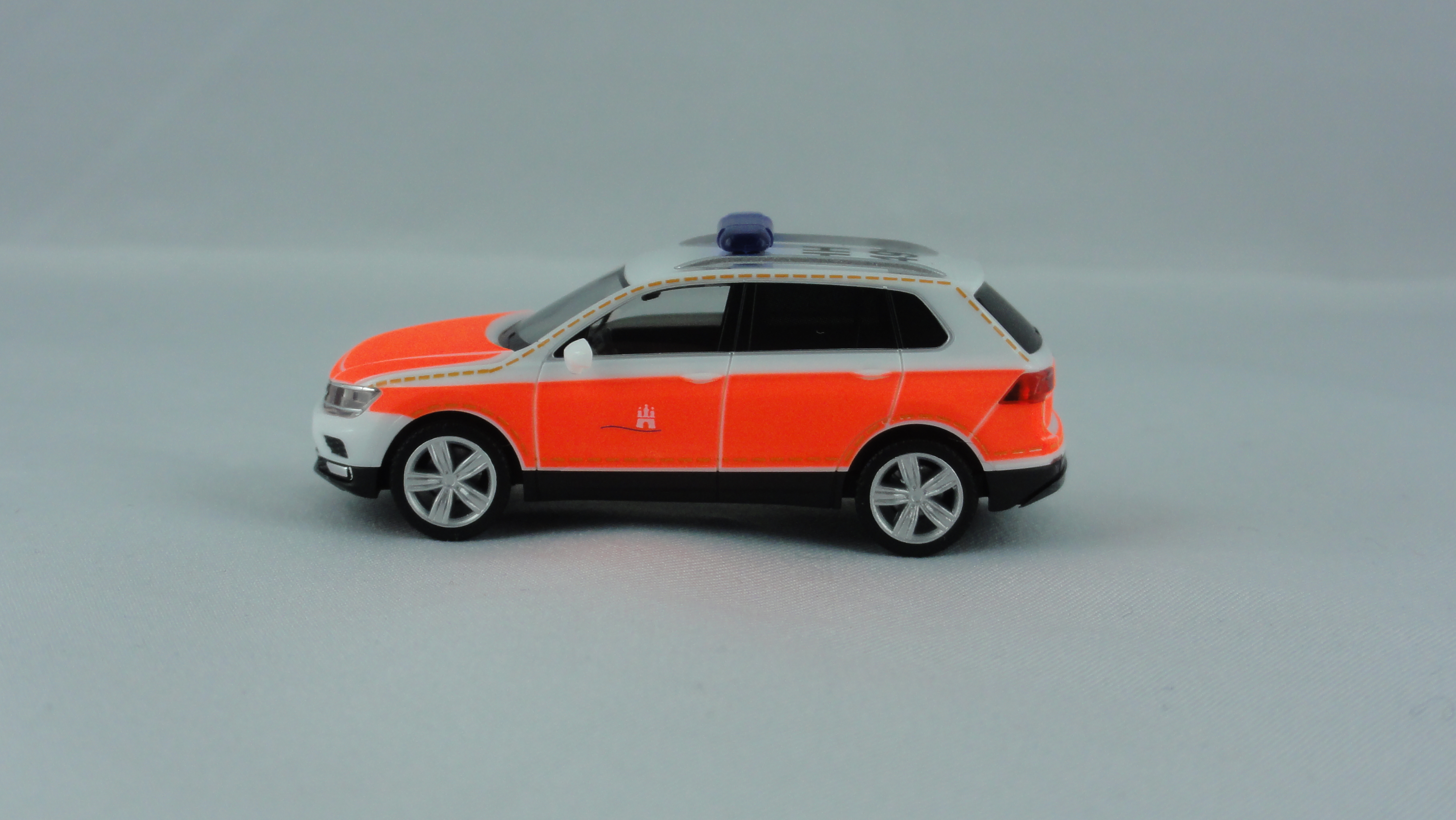 Herpa VW Tiguan KdoW Feuerwehr Hamburg BF Berliner Tor HH – 2491 in weiß mit leuchtrotem Klebefoliendesign. Modell ist allseitig mehrfach im typischen Hamburger Design bedruckt mit Dachkennung. Auflage 200 Stück, Modell kann zum Original abweichen. MODELL IST OHNE KFZ-Kennzeichen, da diese Herpa nicht drucken kann.