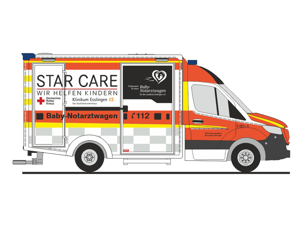 Rietze Einsatz-Serie MB Sprinter 18 WAS RTW.„Baby-NAW DRK Esslingen.“, NH 07-08/24