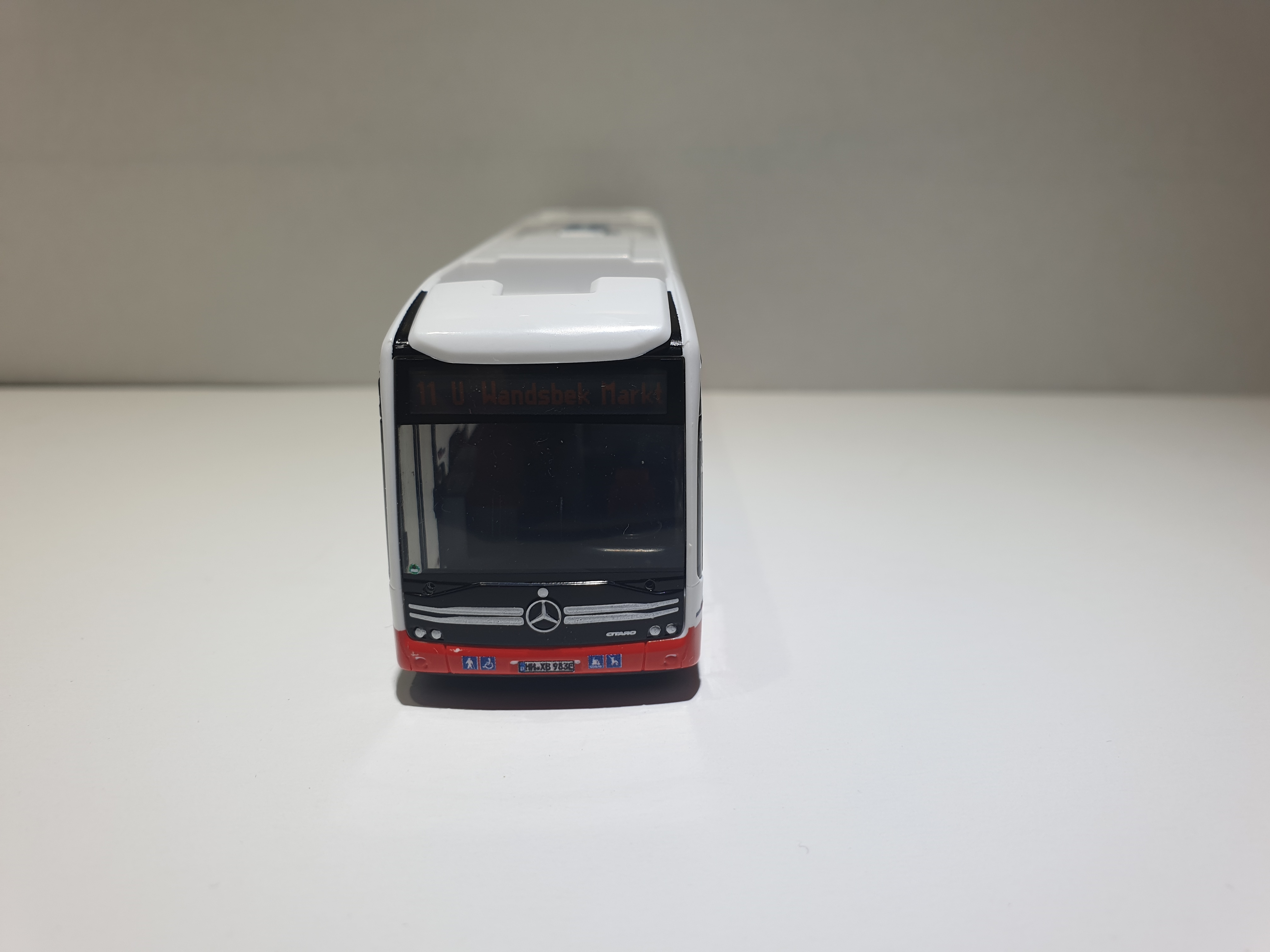Rietze MB eCitaro 2015 Hamburger Hochbahn mit Hochbahnwerbung “ E-Philharmonie “ – Wagennummer 1983- Zielanzeige Linie 11 U Wandsbek Markt – Kennzeichen HH-XB 983E.