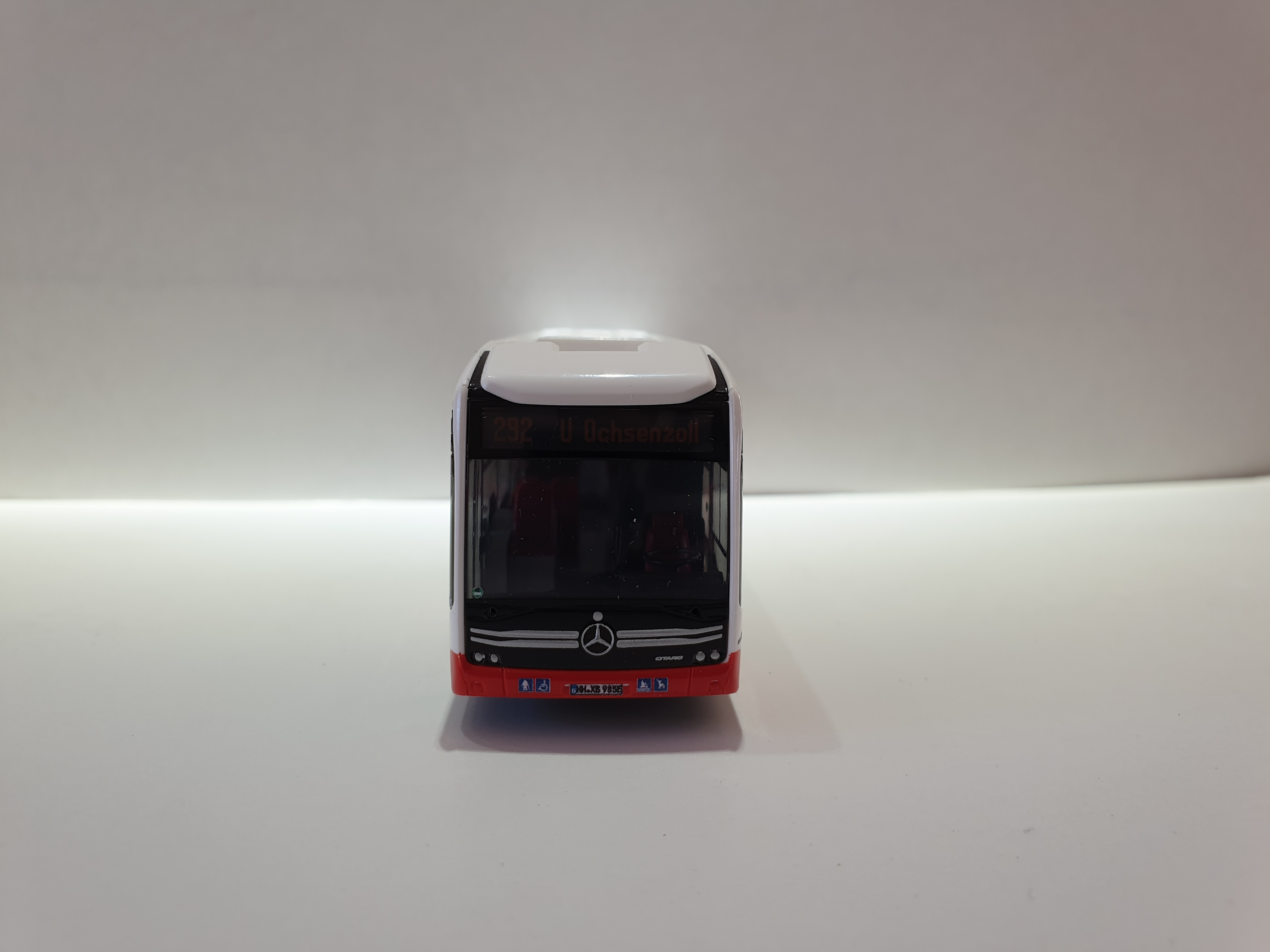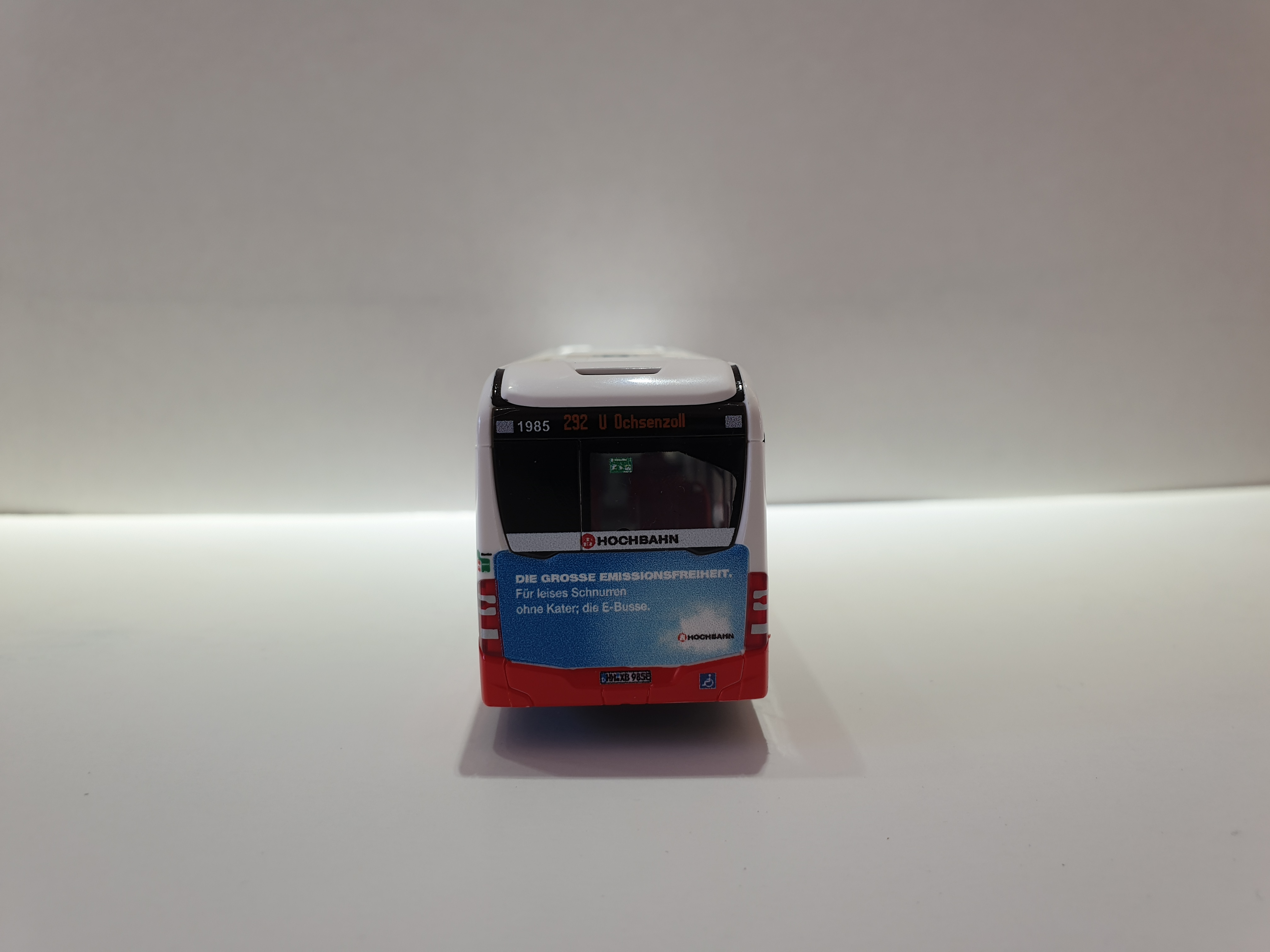 Rietze MB eCitaro 2015 Hamburger Hochbahn mit Hochbahnwerbung “ Emissionsfreiheit “ – Wagennummer 1985- Zielanzeige Linie 292 U Ochsenzoll – Kennzeichen HH-XB 985E.