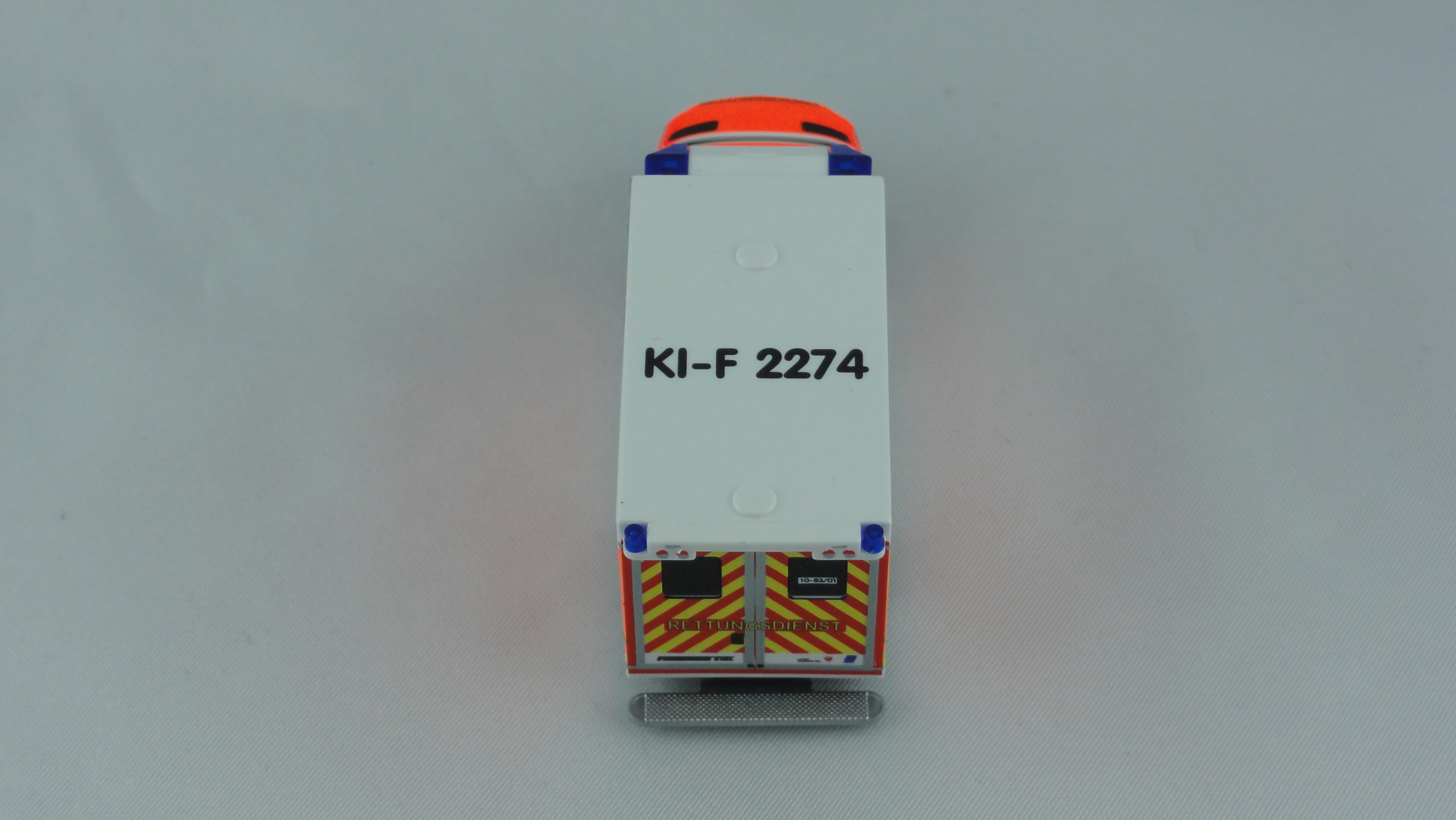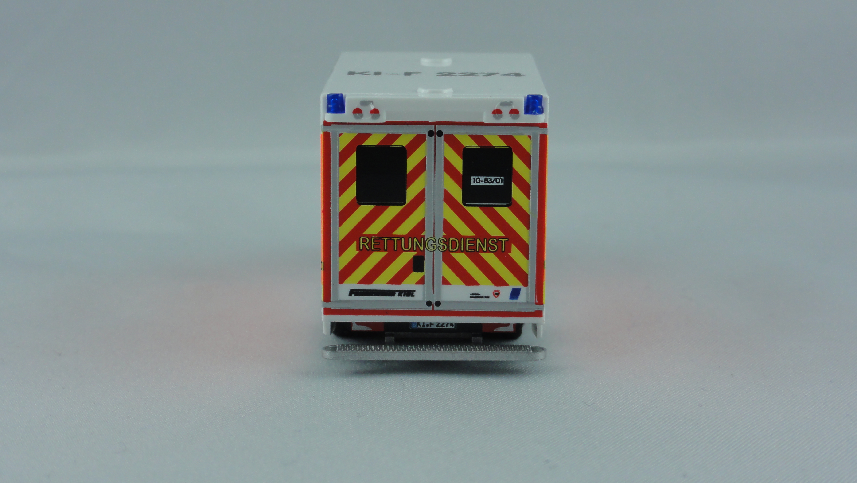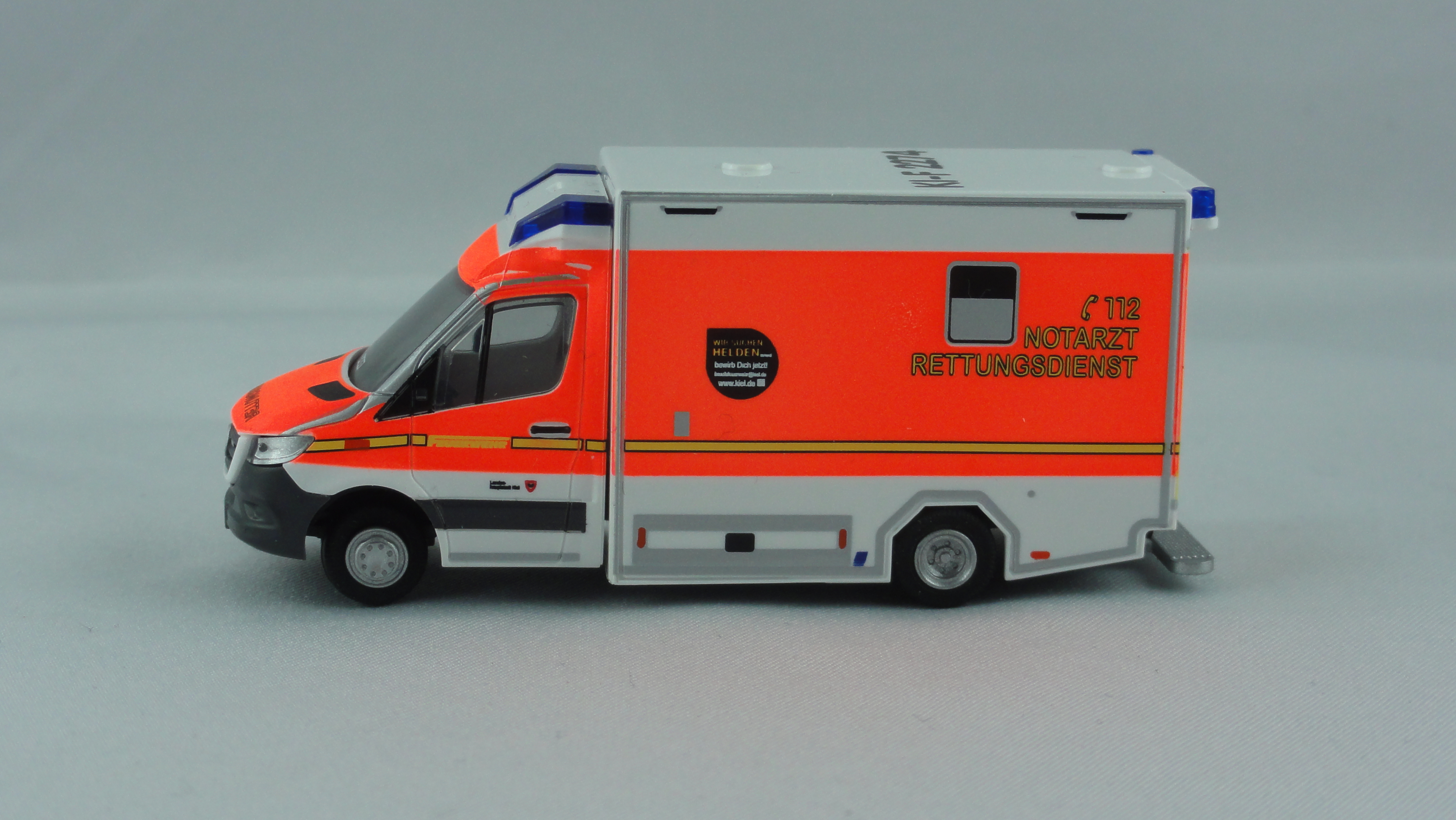 Modell wird allseitig mehrfach im alten Design der Feuerwehr Kiel bedruckt, mit KFZ-Kennzeichen, Wachkennung,