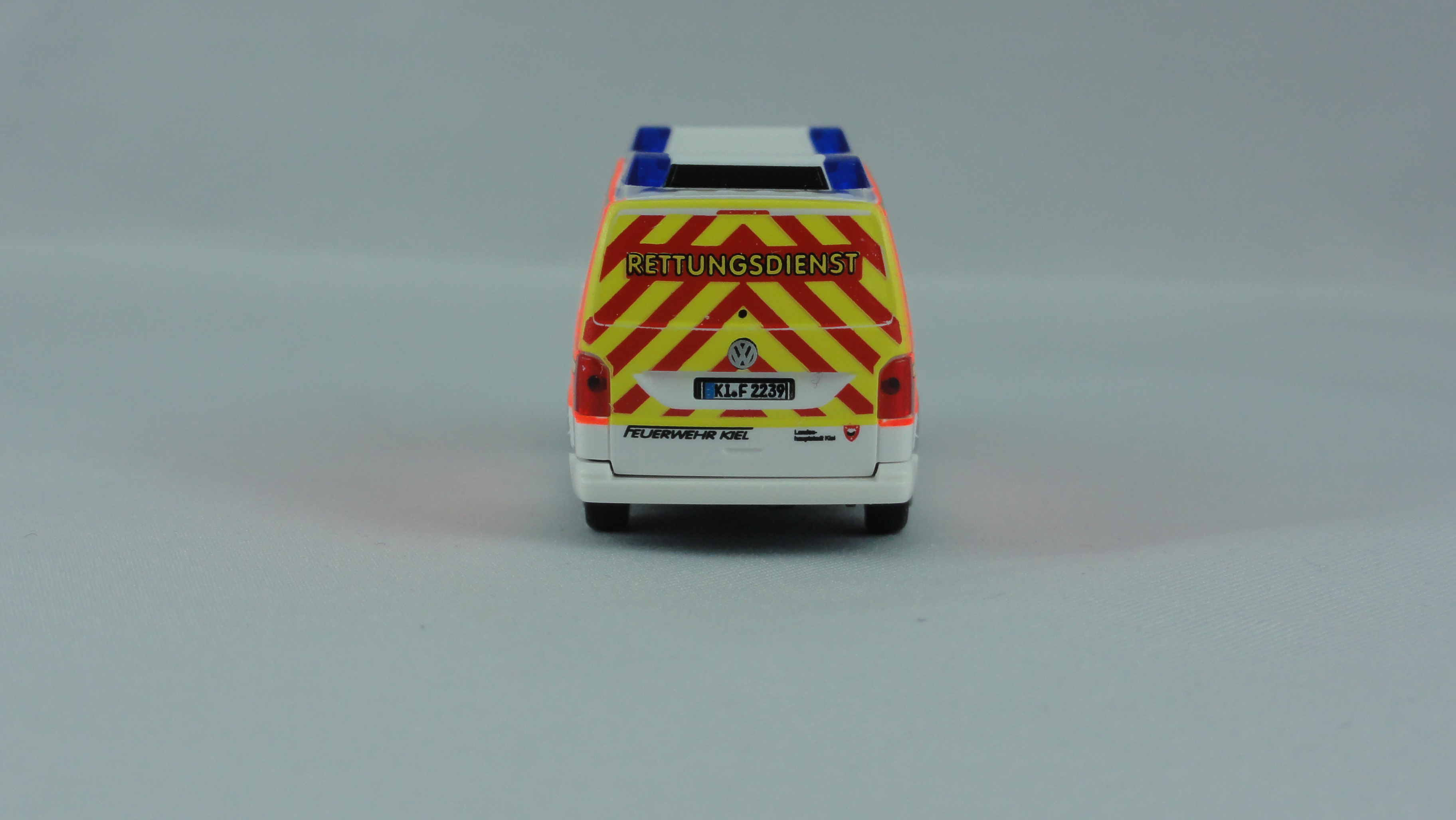 Das Modell wird allseitig mehrfach im alten Design der Feuerwehr Kiel bedruckt, mit KFZ-Kennzeichen, Wachkennung, Dachkennung,